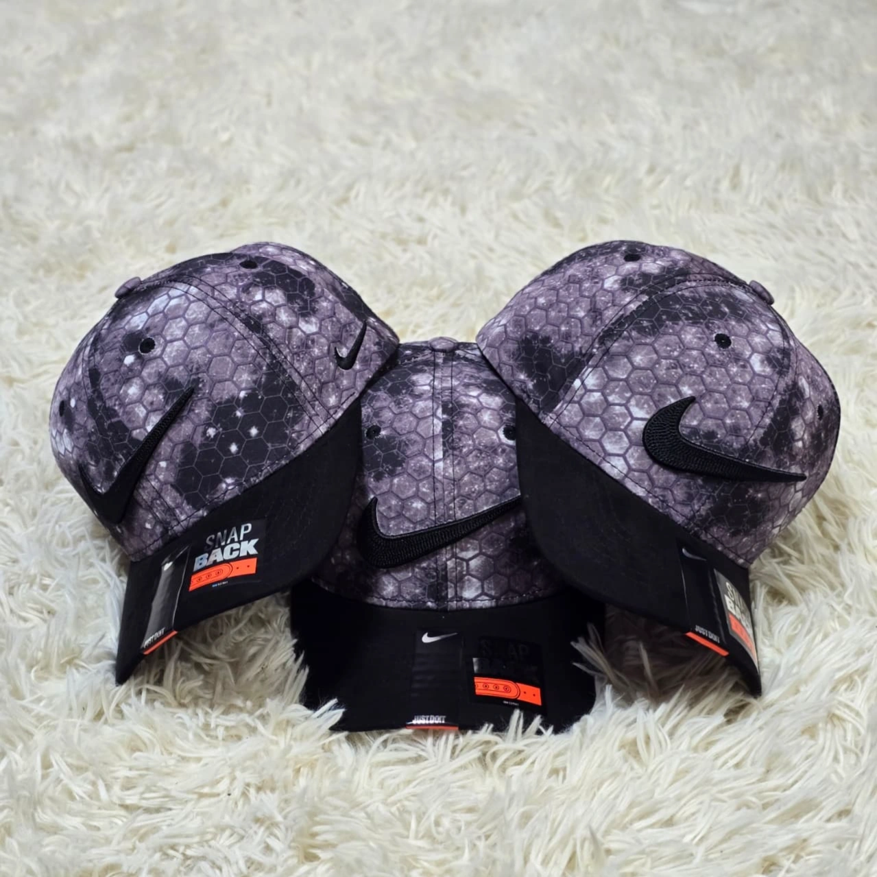 Unleash your urban style with these bold Nike caps, featuring a striking pattern.