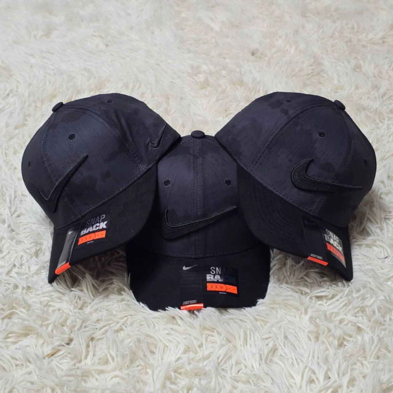 Nike black snapback caps featuring an embroidered "Swoosh" logo on the front panels. They are characterized by a 6-panel structured design and include retail "Snapback" stickers on the brims.