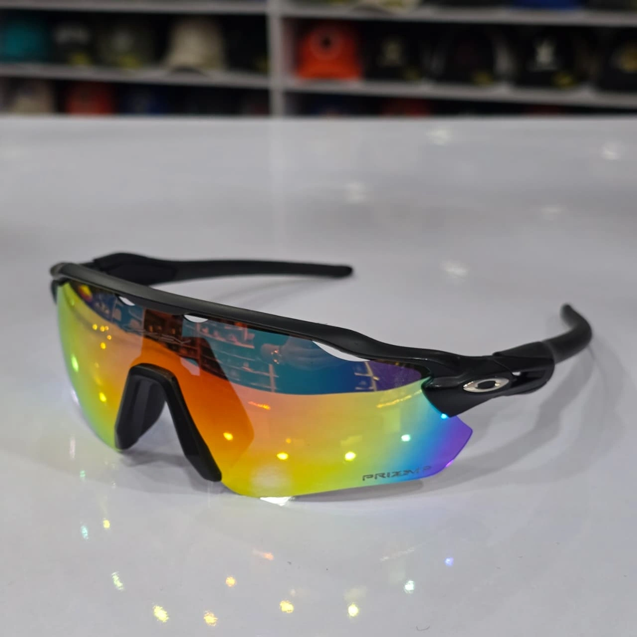 Oakley Radar EV Path sunglasses featuring a polished black frame with red ear socks and a multicolored mirrored lens. This model is a milestone in sport performance eyewear, designed for athletes who require an extended upper field of vision.