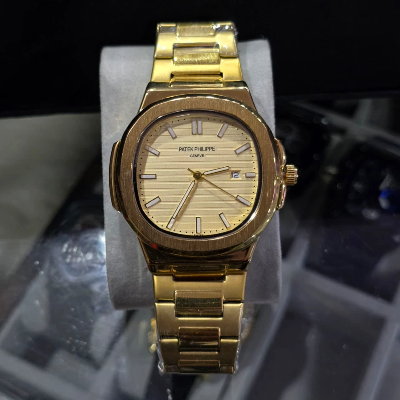 Design: It showcases the signature rounded-octagonal bezel and a gold-colored horizontal ridged dial, characteristic of the Nautilus series.