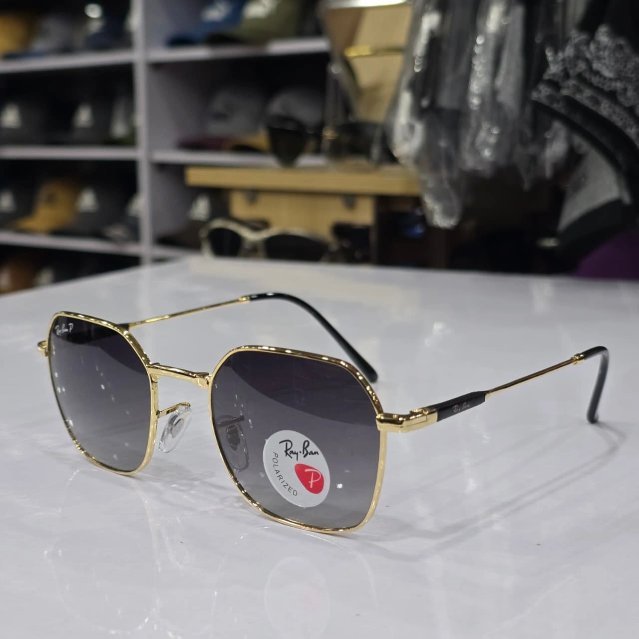 Ray-Ban "Jim" sunglasses, part of the brand's geometric metal frame family. They feature a distinct irregular, octagonal shape that blends retro and modern styles.