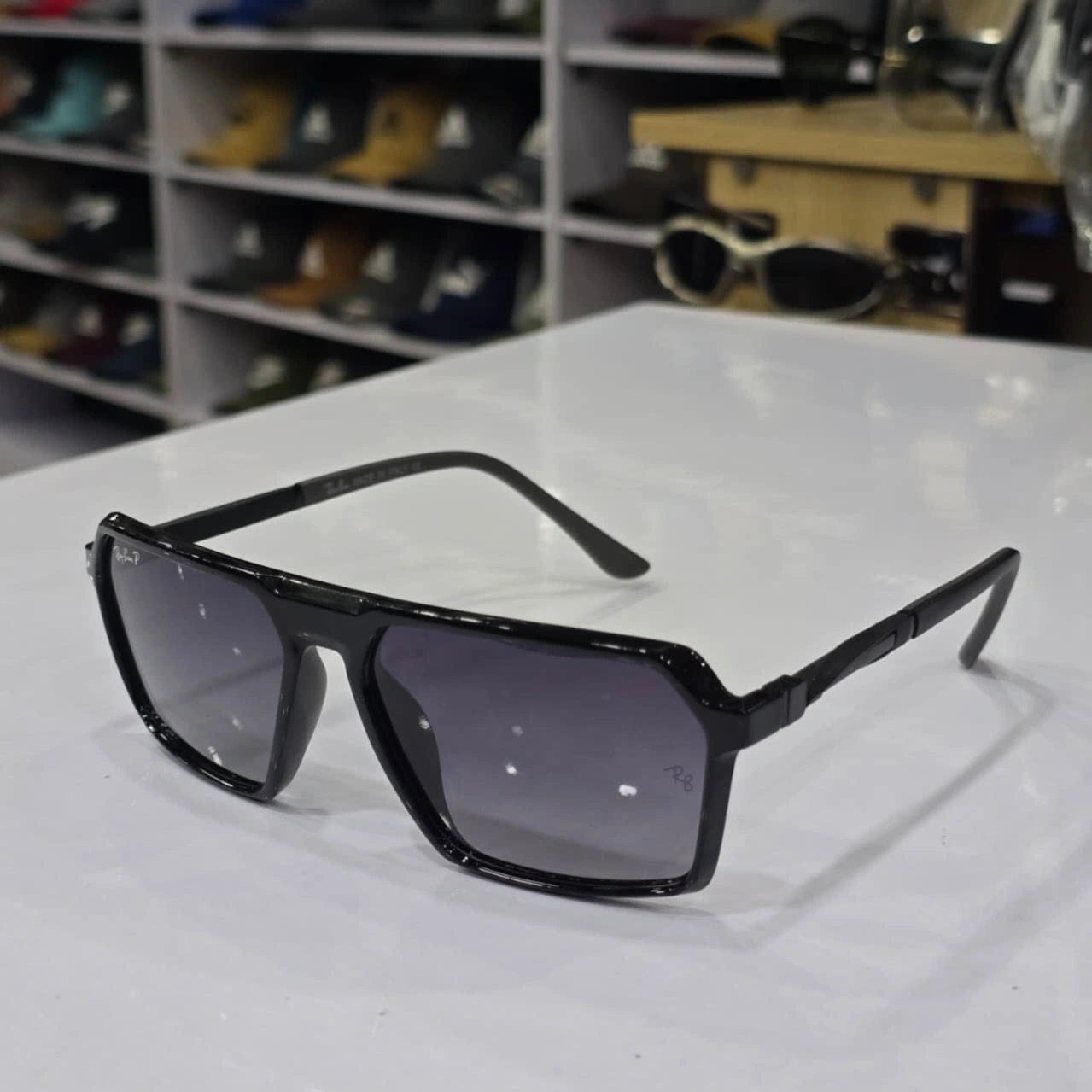 Markings: The signature cursive Ray-Ban logo is visible on the top corner of the left lens (wearer's left). A small etched marking in the bottom corner of the wearer's right lens (foreground) indicates these are polarized to reduce glare.
