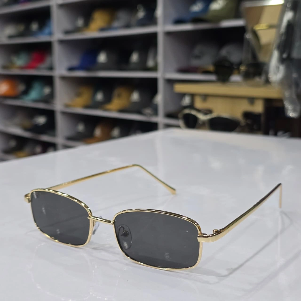 retro small rectangle sunglasses featuring a polished gold-tone metal frame and dark lenses. This minimalist "90s style" is a popular unisex choice for its sleek, lightweight profile.