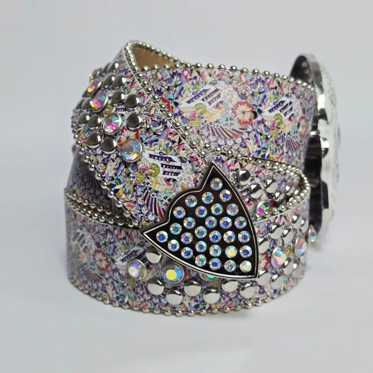 Embellishments: Heavily adorned with rows of rhinestones (diamonds) and metallic rivets or studs along the entire length.
