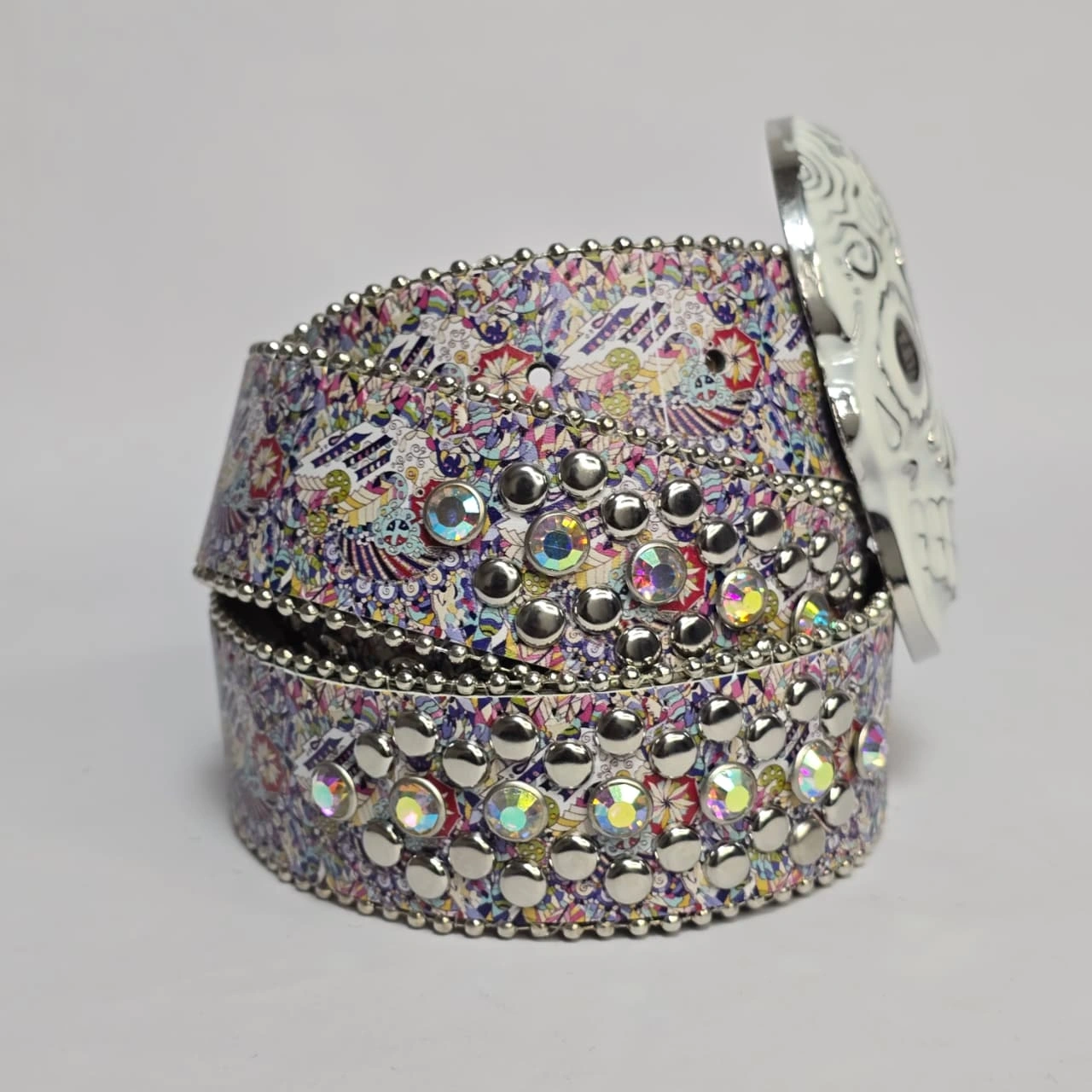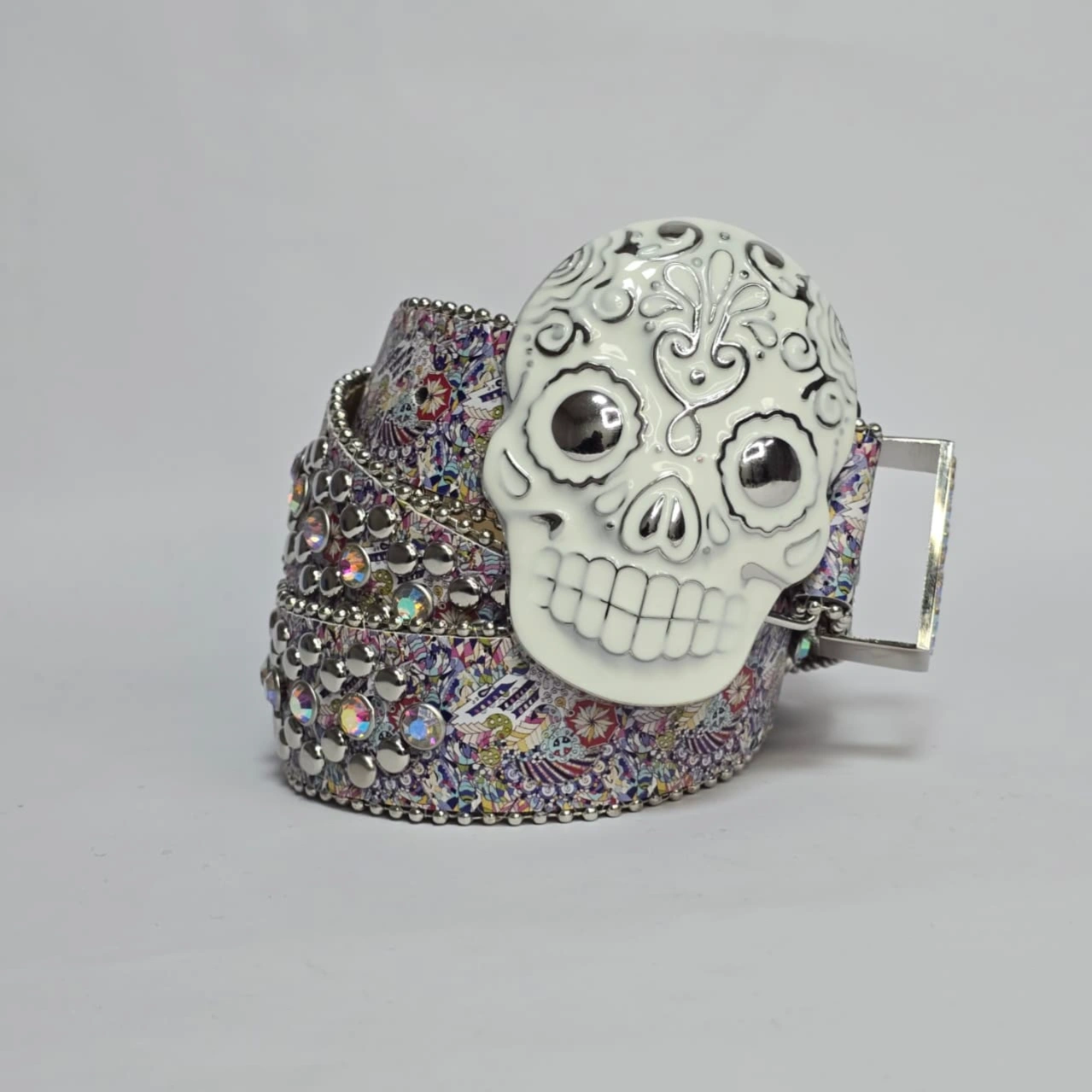 rhinestone-studded "ice belt" featuring a prominent white "sugar skull" buckle. It is characterized by its Y2K, hip-hop, and punk rock aesthetic, often categorized as a "Western" or "cowboy" style bling belt.