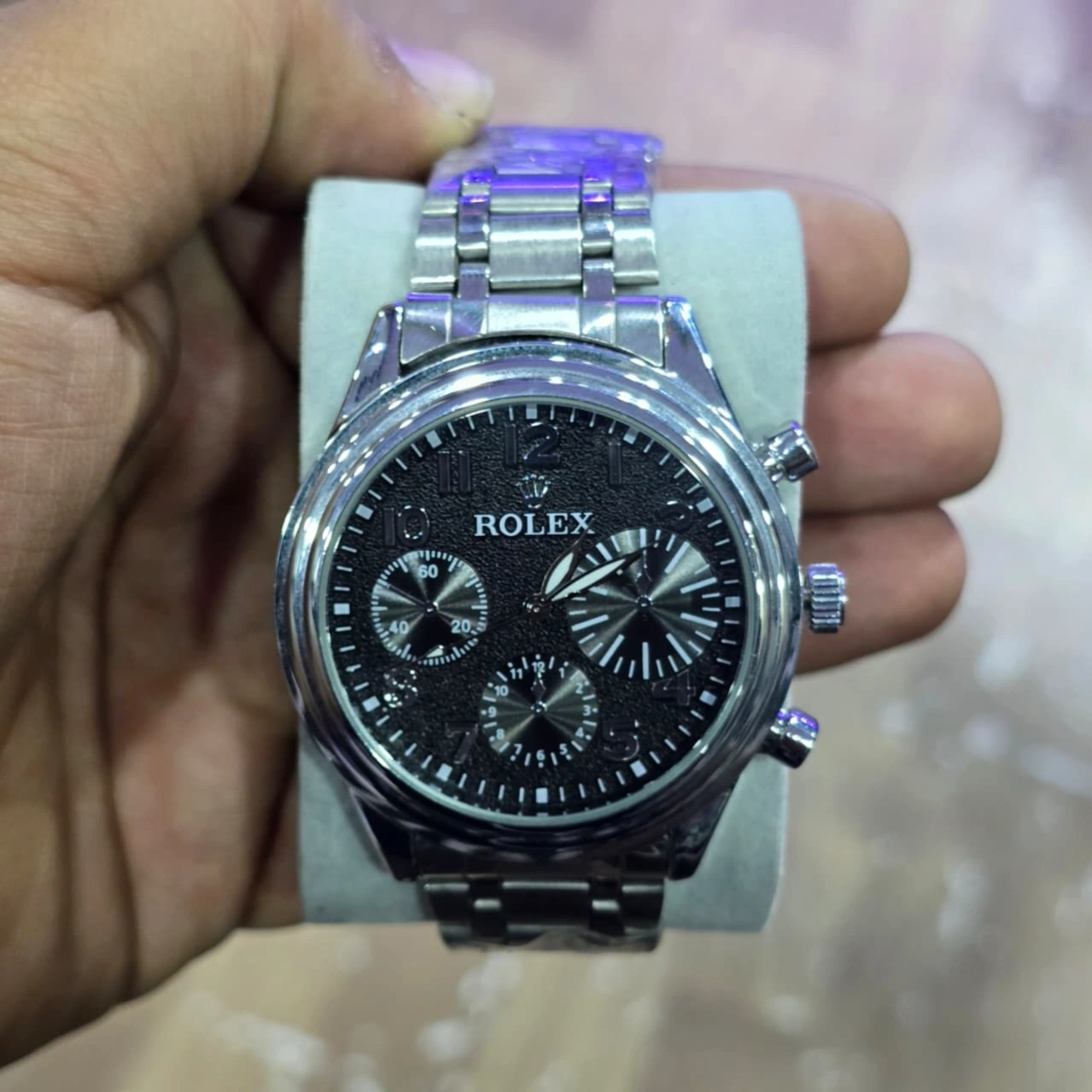Dial: Black textured dial featuring the iconic Rolex crown logo, three decorative sub-dials, and Arabic numerals at certain hour markers.