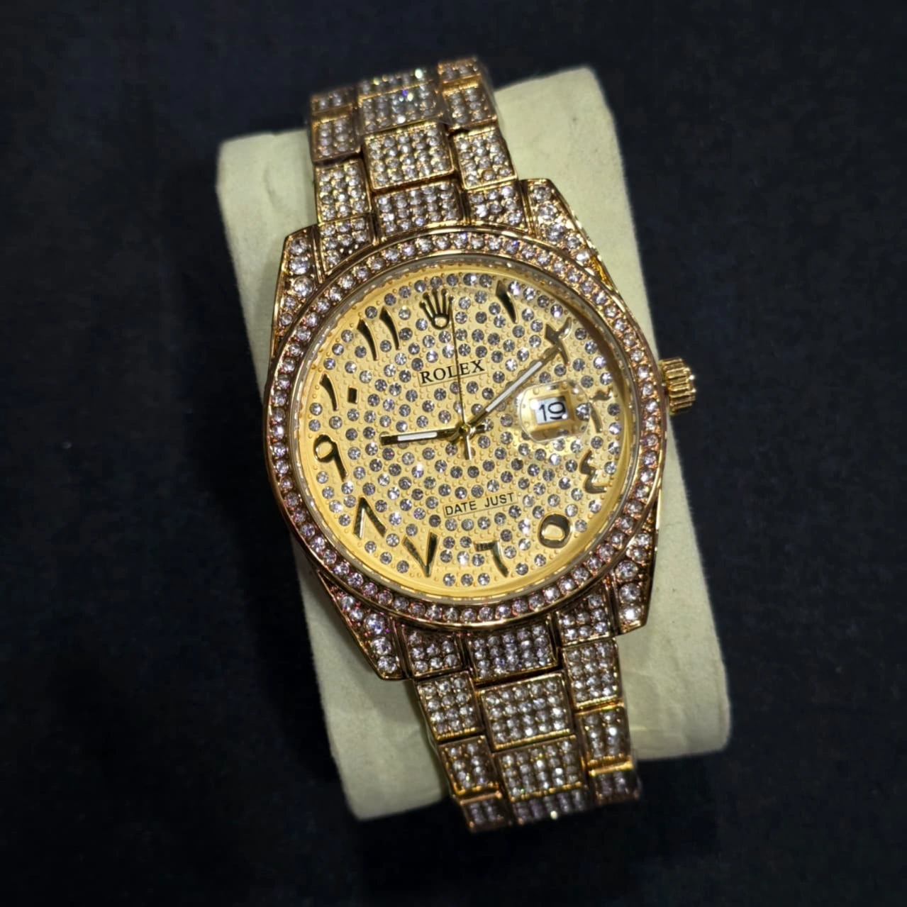 Fully "iced-out" Rolex Datejust style timepiece, specifically featuring a gold-tone finish and a dial with Arabic numeral hour markers. It is a popular luxury-style accessory often sought for its bold "bling" aesthetic.