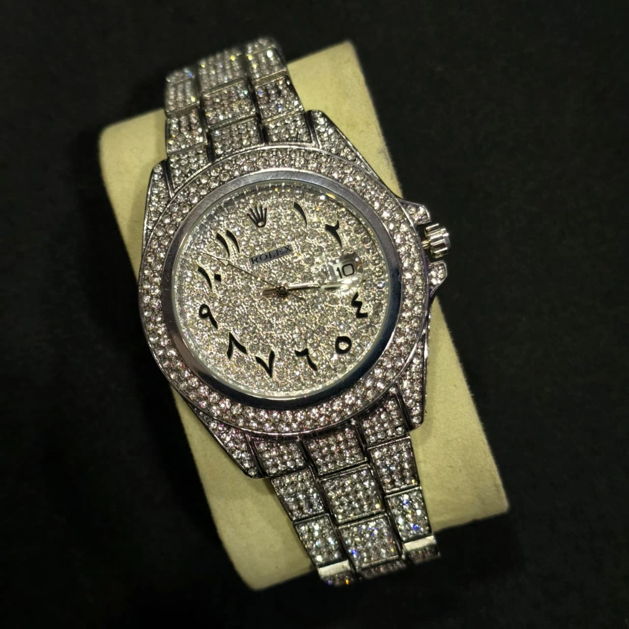 ROLEX Full Iced Out Watch, a luxury-style timepiece often marketed under brands such as Rolex as a "first copy" or homage model. It is characterized by its bold "bling" aesthetic, featuring extensive crystal setting across the entire watch.