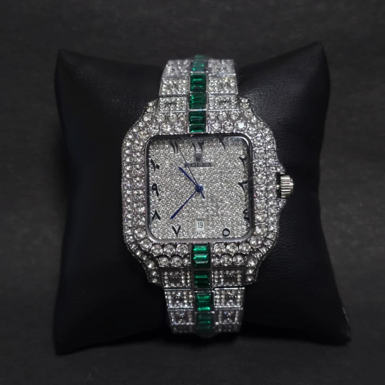 • Design: Square-cased quartz wristwatch featuring a full "iced-out" diamond look with over 500 crystals/zirconia stones across the bezel, dial, and strap.