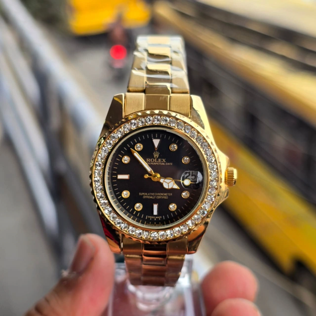 Rolex Oyster Perpetual Datejust style timepiece, a luxury-inspired design that is highly popular for its bold and "iced out" aesthetic. This specific gold-tone model features a round black dial and a bezel heavily accented with sparkling crystals or rhinestones.
