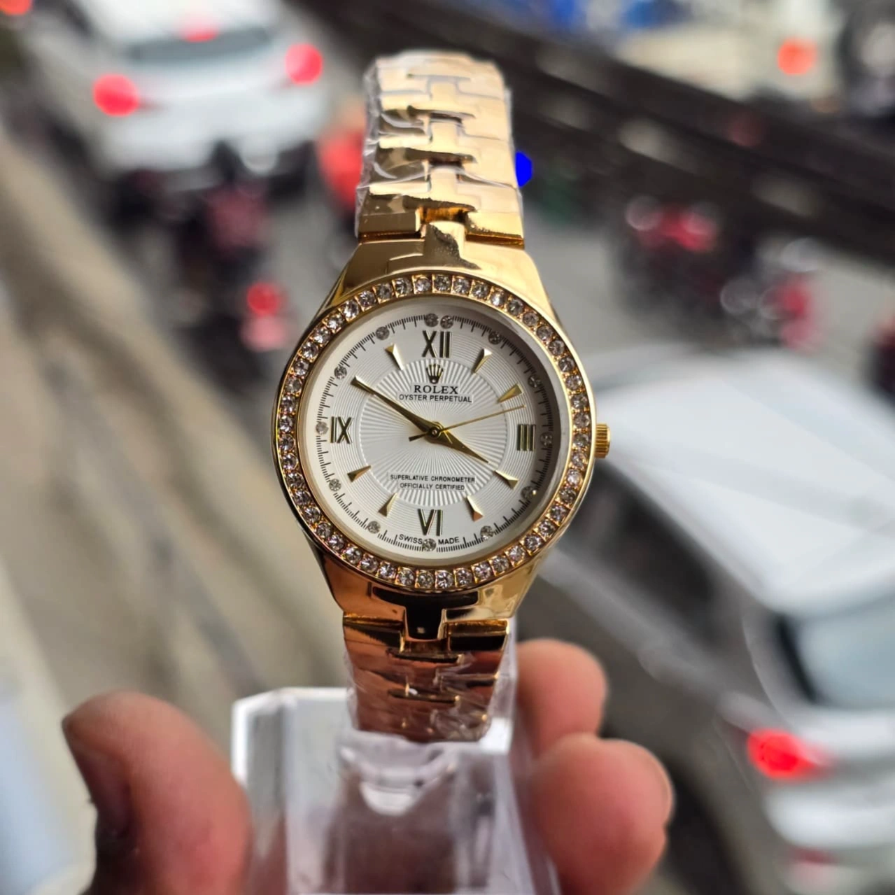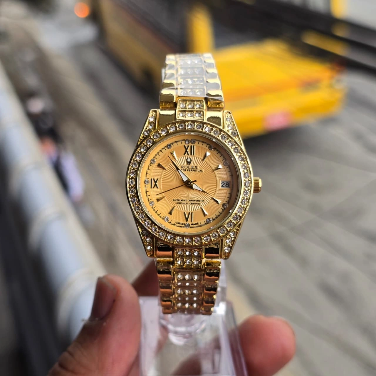 Bezel: A prominent feature is the diamond-studded bezel, which provides a luxurious sparkle.