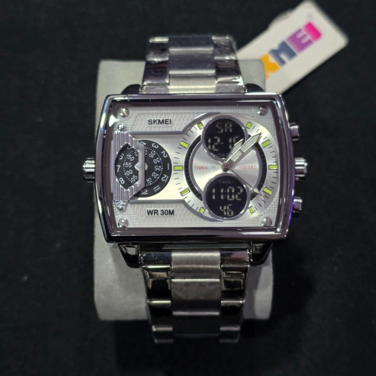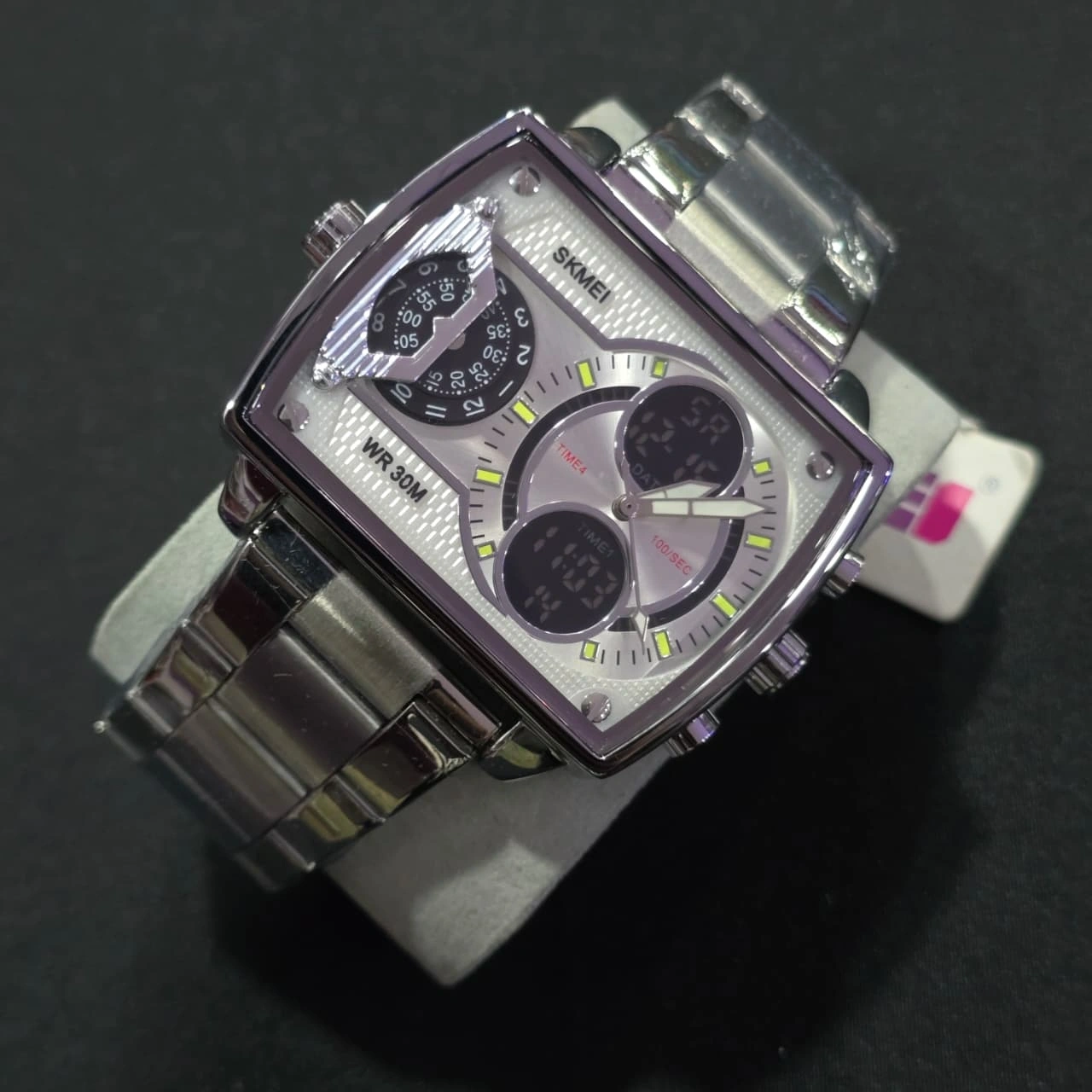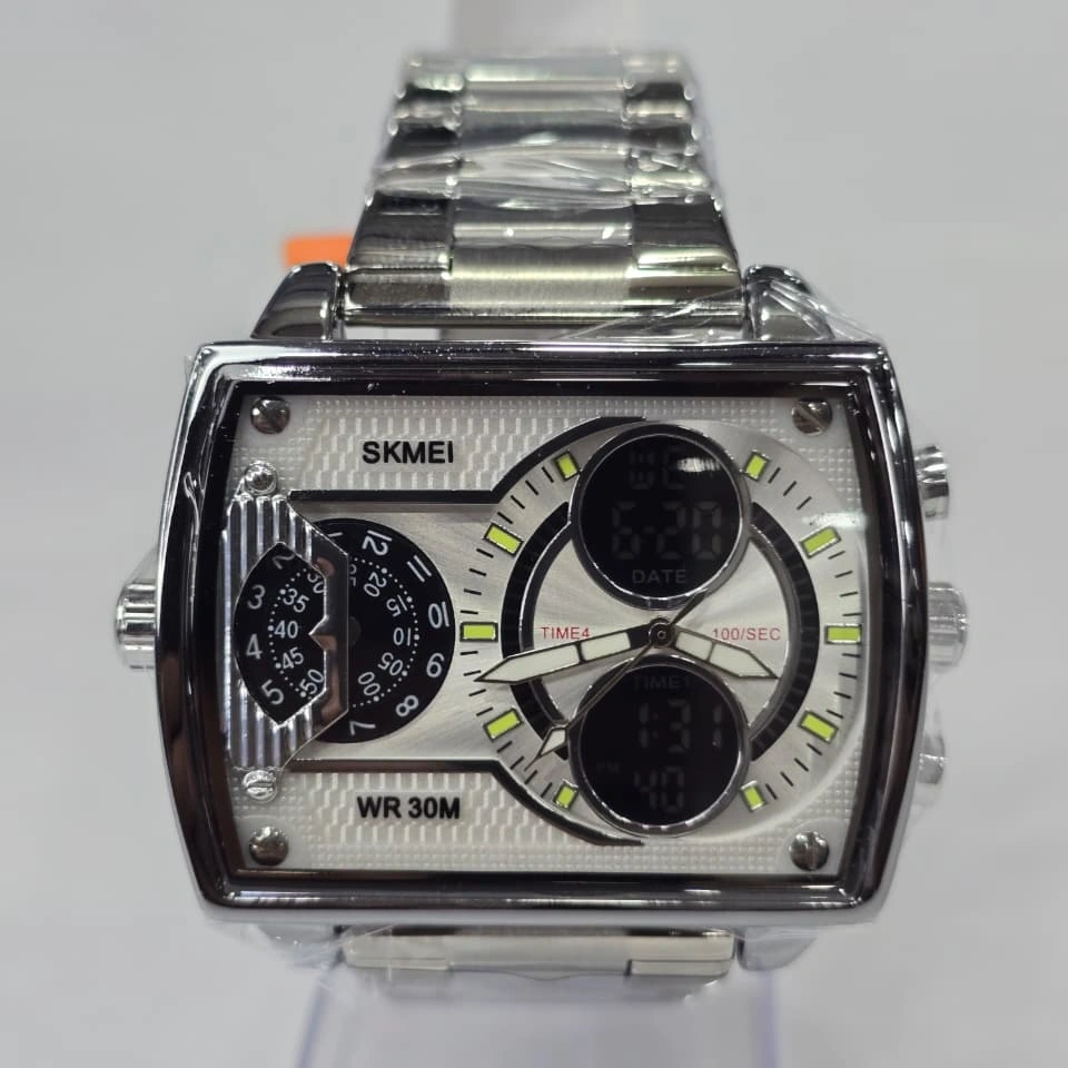 Design: It has a bold rectangular/square zinc alloy case with a polished finish and an integrated stainless steel bracelet. The watch is also available with a leather or silicone strap.