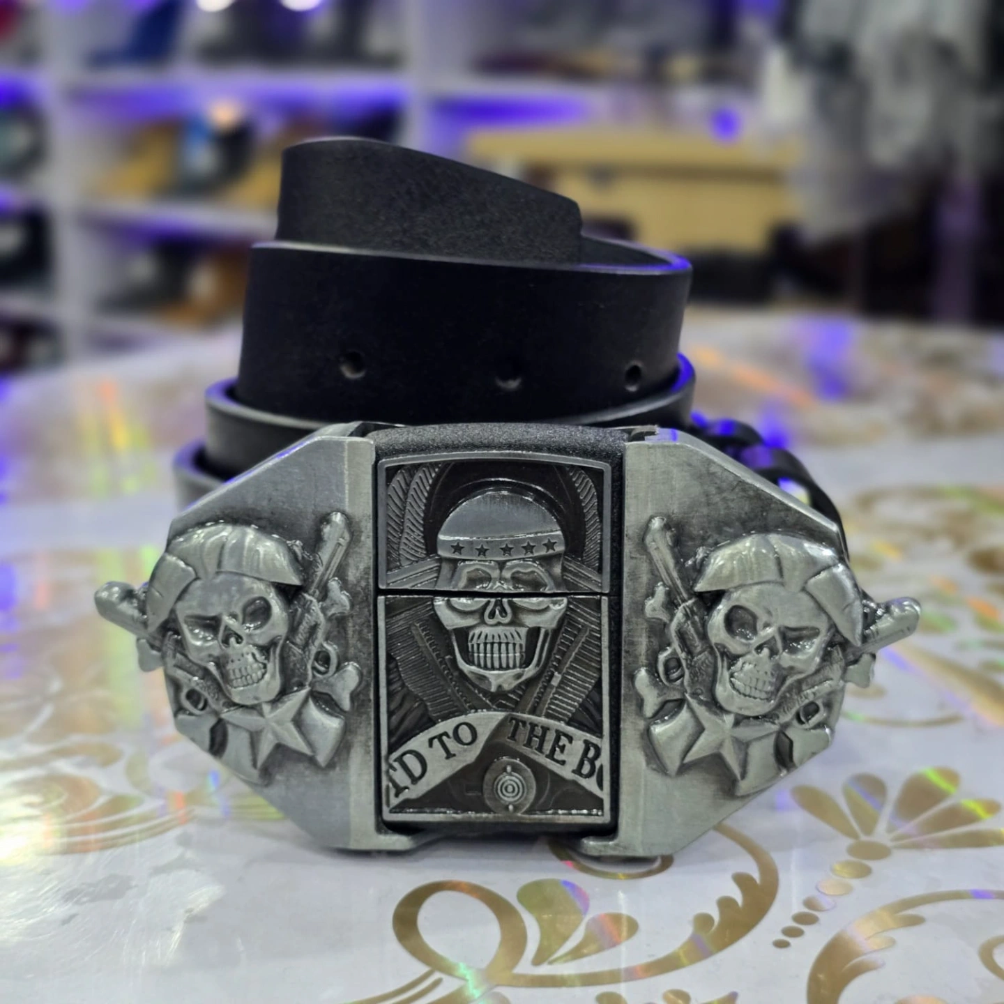 Built-in Lighter: The centerpiece of the buckle is a functional, removable lighter (often a kerosene or flip-top style).
