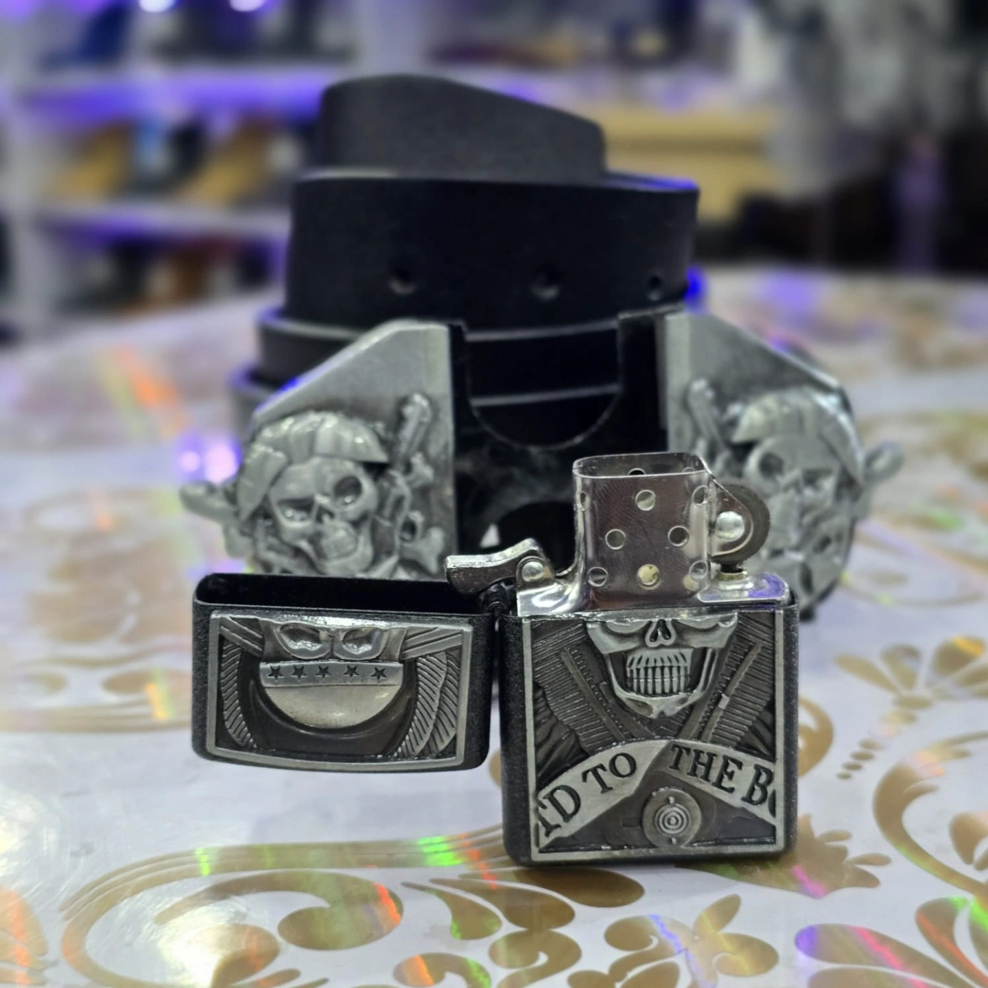 Skull Lighter Belt Buckle, a functional accessory that features a removable flip-top lighter integrated into a western-style belt buckle.