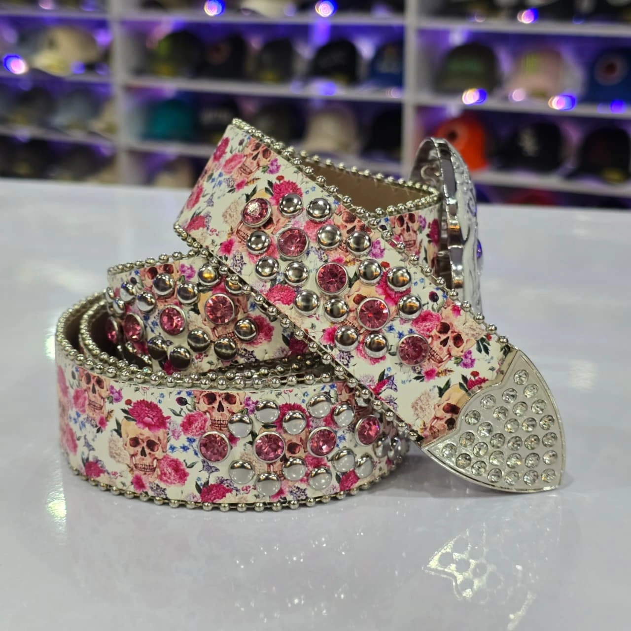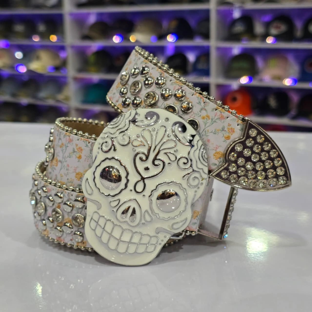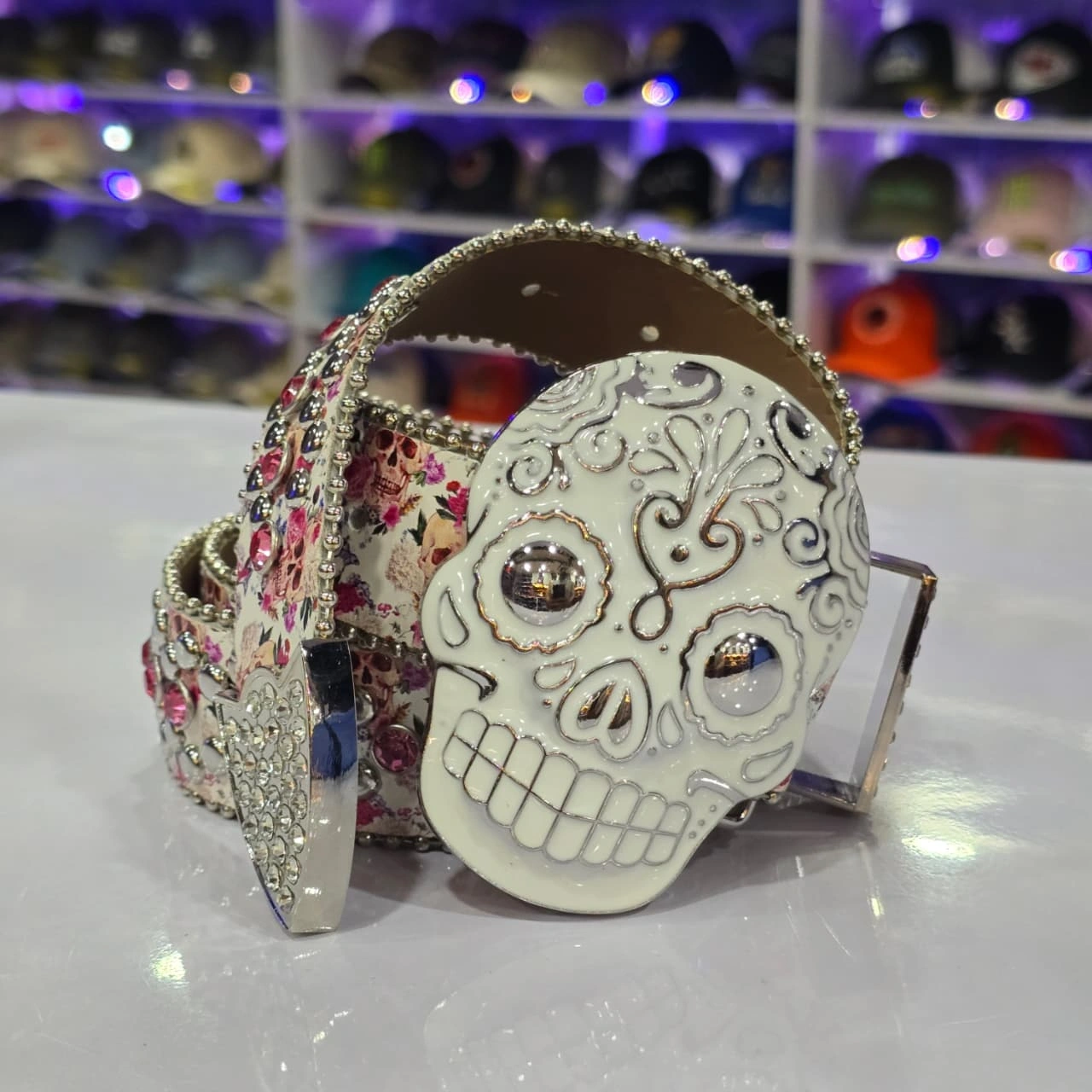 Design: The belt features a large, ornate skull buckle, often with a "sugar skull" or "punk rock" aesthetic. The strap itself is typically decorated with multiple rows of rhinestones and metal studs.