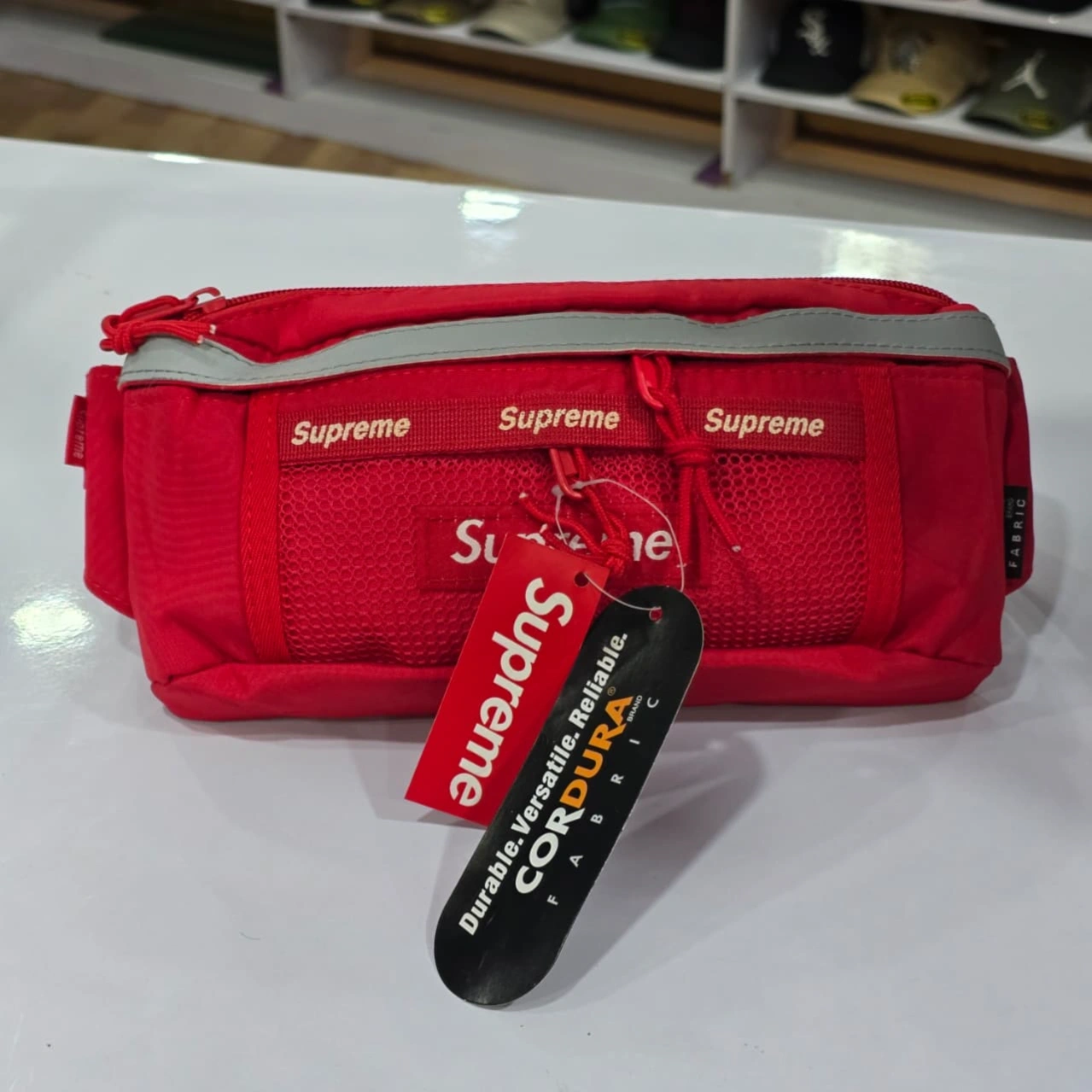 Design: The bag is characterized by its vibrant red color and multiple Supreme-branded elements, including a repeat logo pattern along the top webbing. It includes a reflective silver strip across the top for visibility.