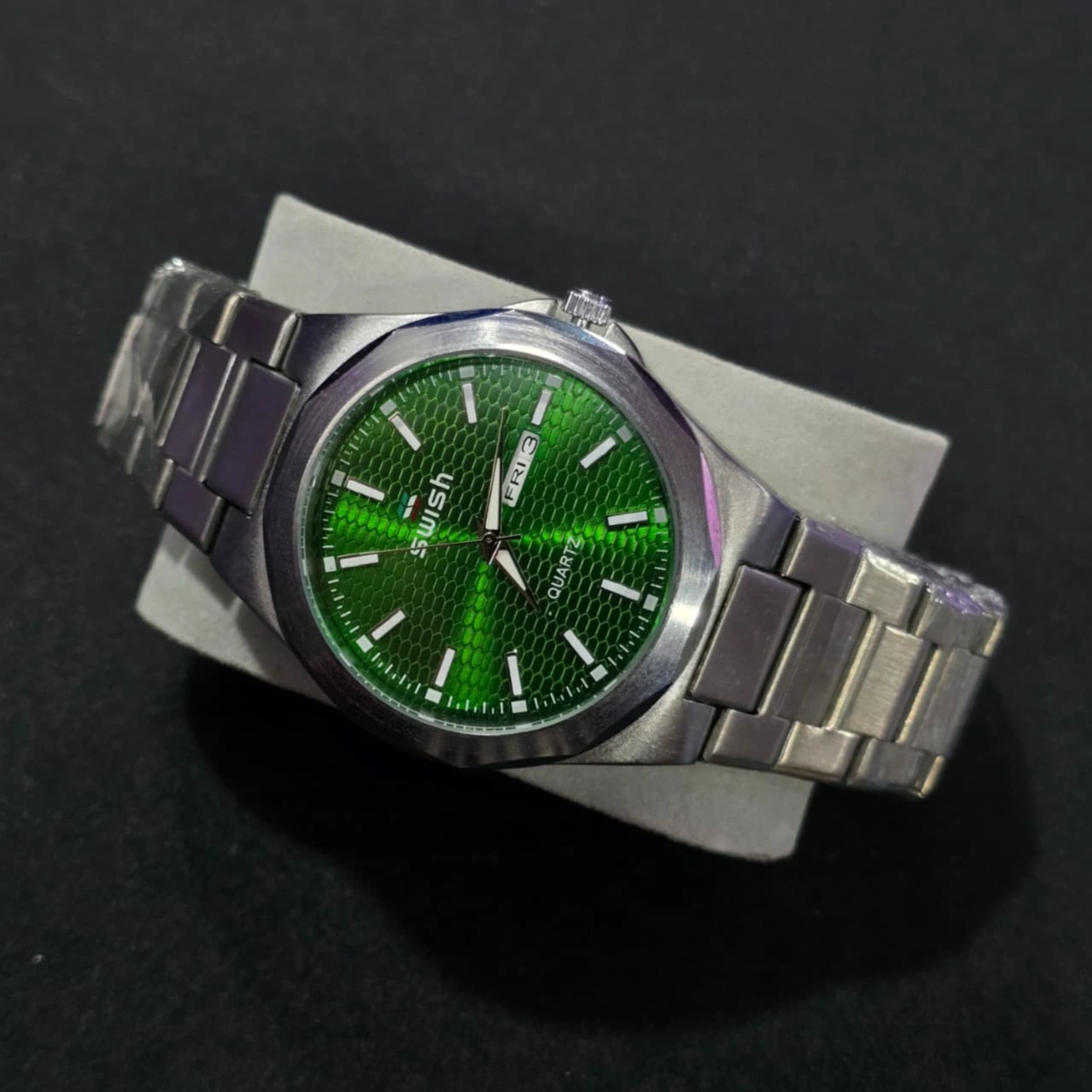 Design: It features a slim, integrated-bracelet design heavily inspired by 1970s luxury sports watches. The distinctive emerald green dial has a textured sunburst or honeycomb pattern that catches the light.