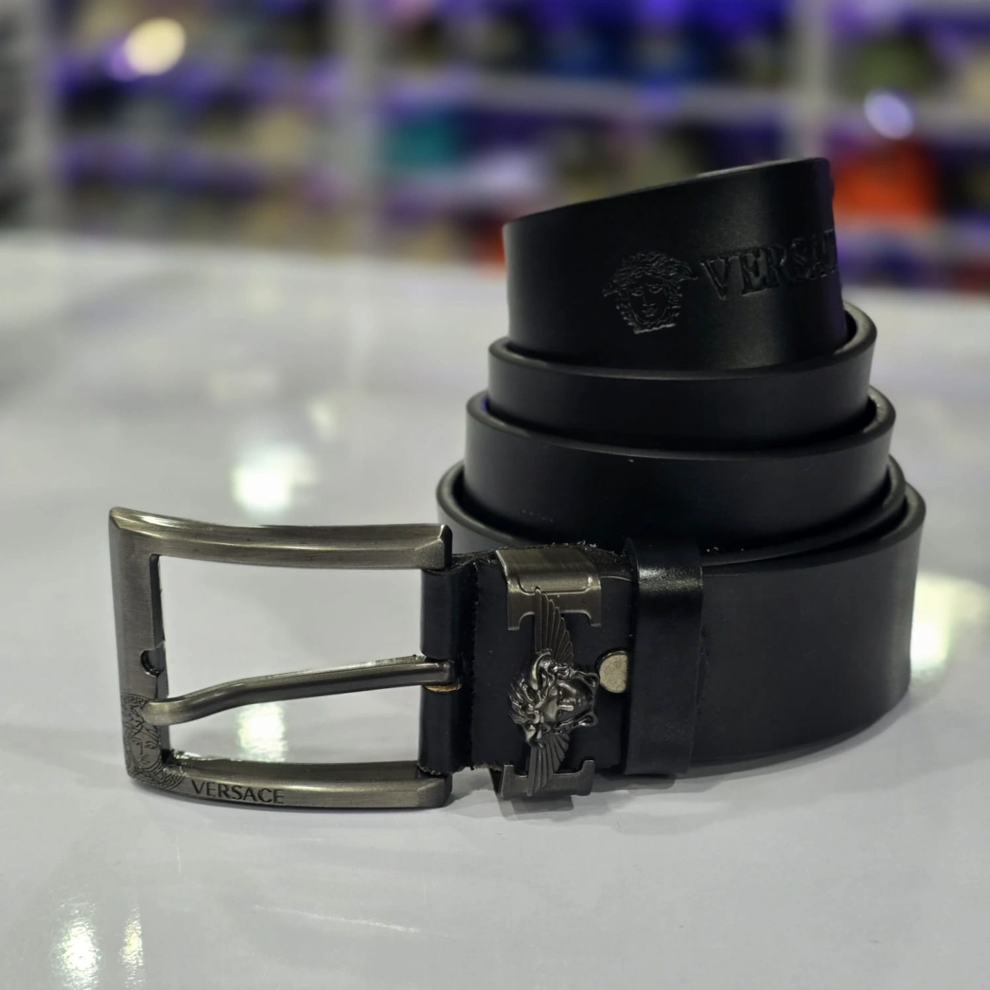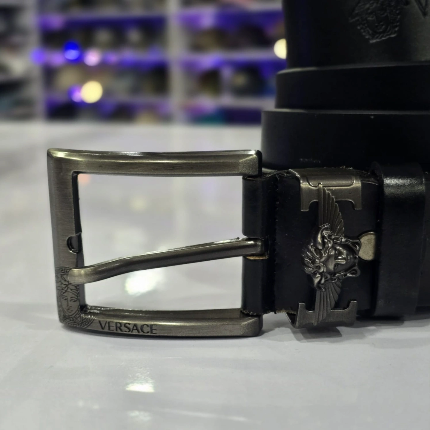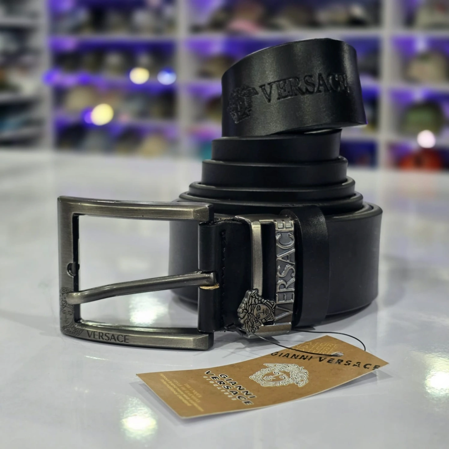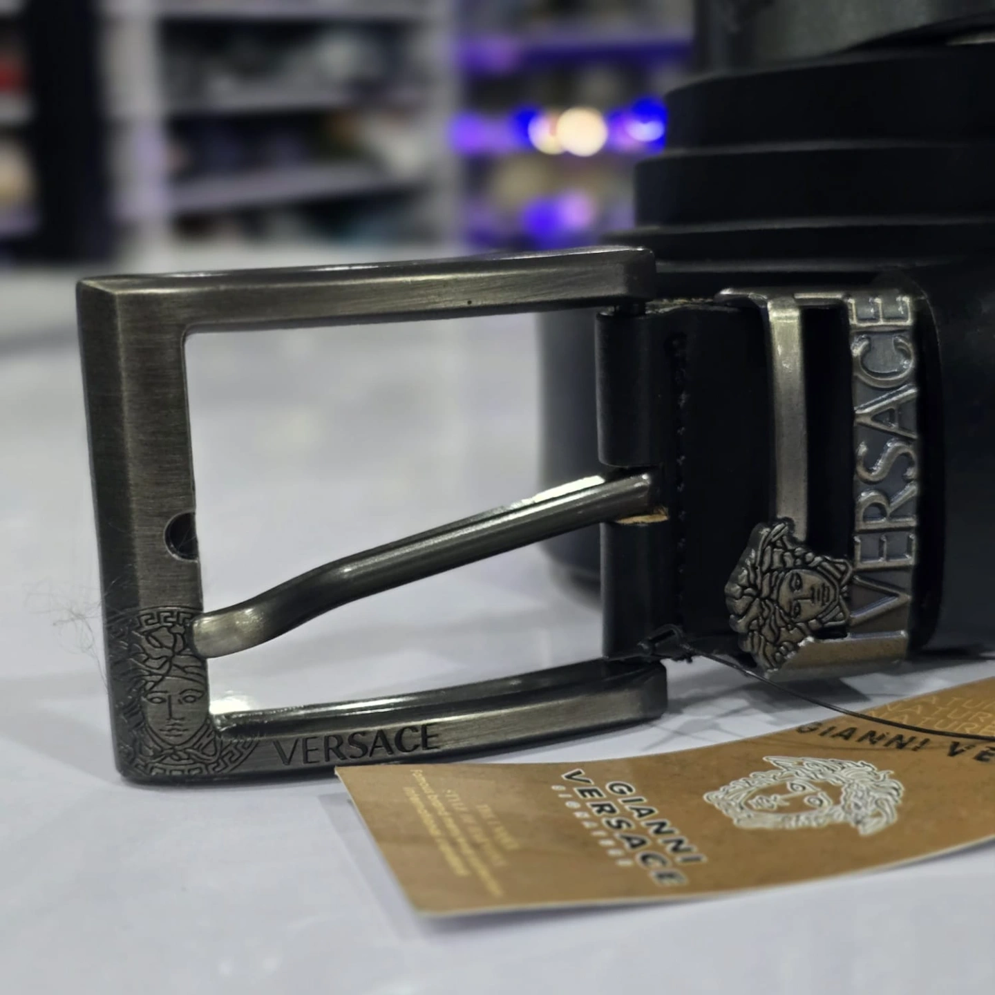 Iconic Buckle: The belt is defined by a rectangular metal alloy pin buckle prominently featuring the Medusa head emblem. The buckle in the image also includes "VERSACE" engraved at the bottom.
