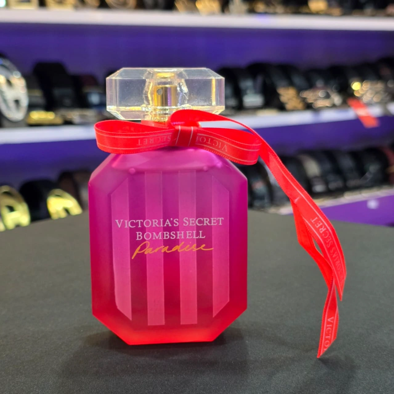 Bottle Design: The fragrance is housed in a signature emerald-cut, pink-striped bottle with a distinctive ribbon tied around the neck.