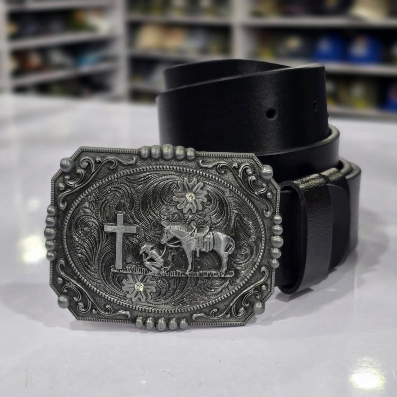 Western Cowboy Kneeling Prayer Belt, a traditional piece of Western wear that combines religious symbolism with classic cowboy motifs.
