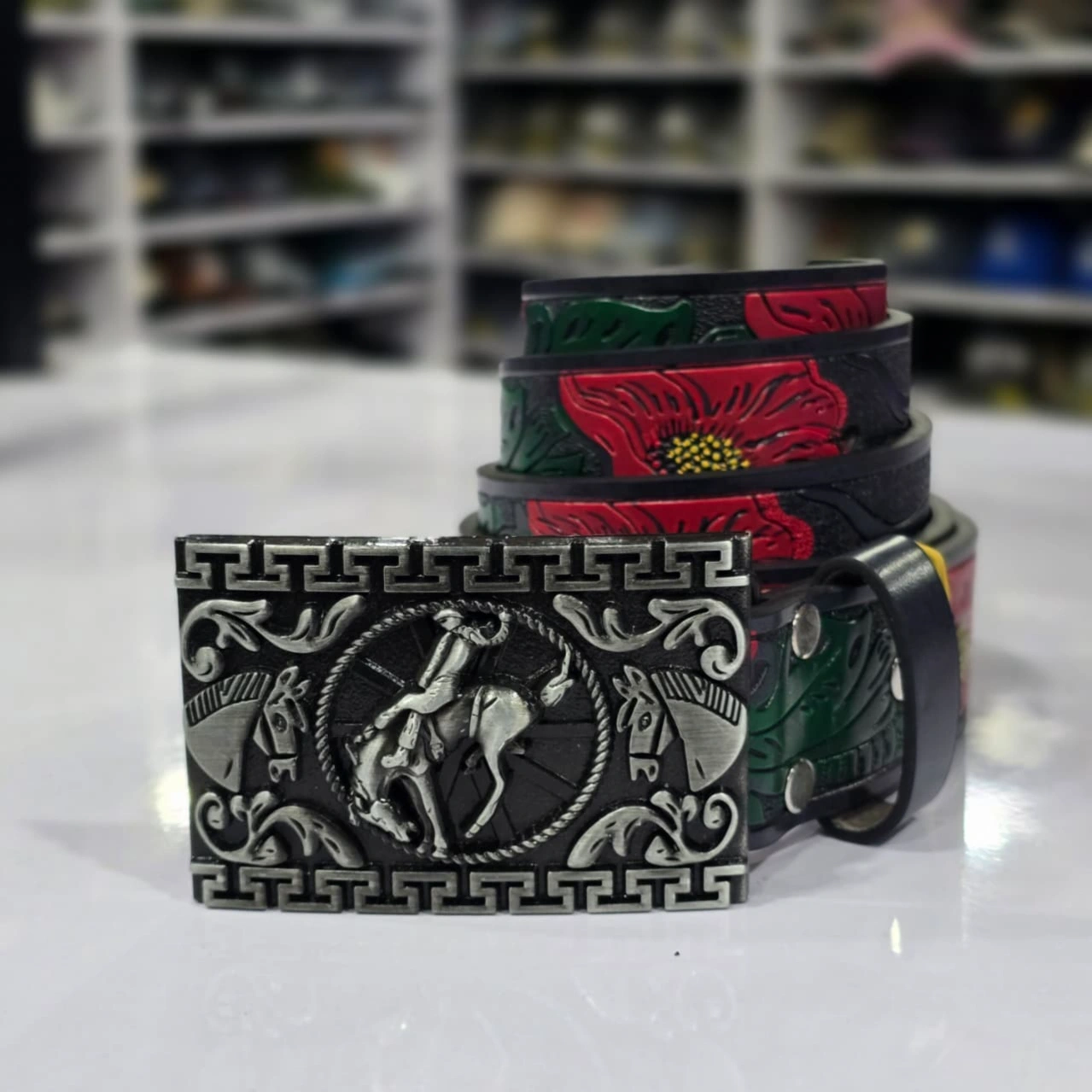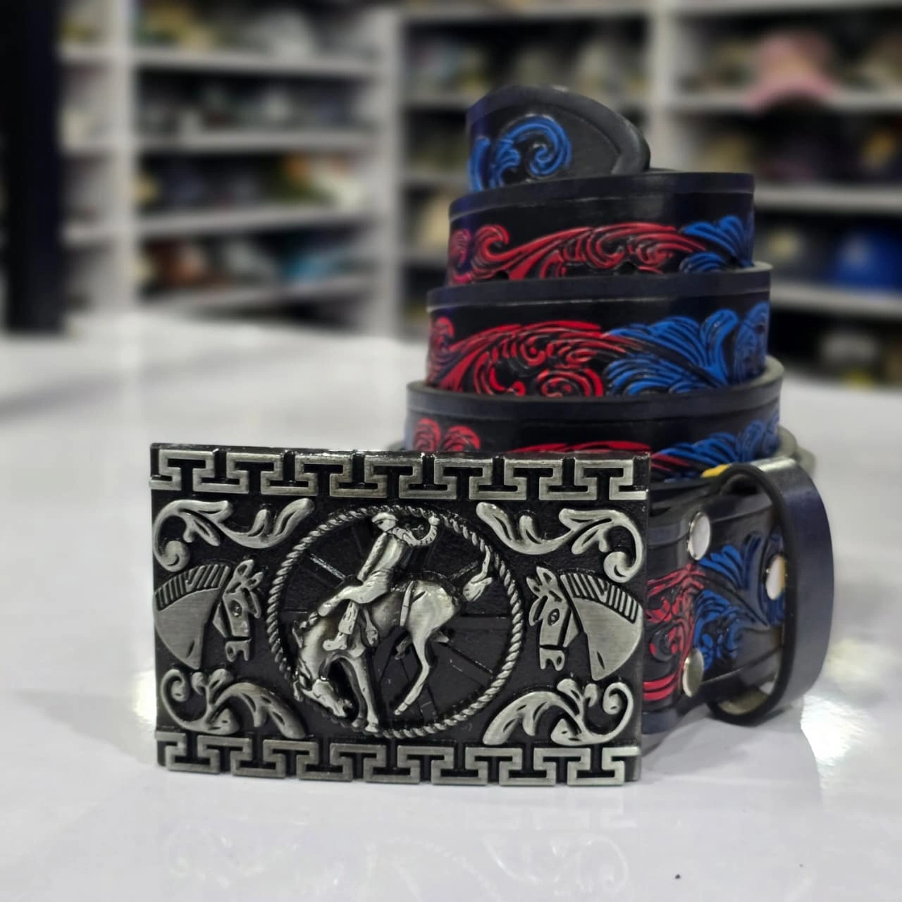 Iconic Buckle: The defining feature is a large, rectangular silver-finished trophy buckle. It features a central medallion of a cowboy riding a bucking horse, surrounded by an embossed Greek key (meander) border and ornate floral scrollwork.