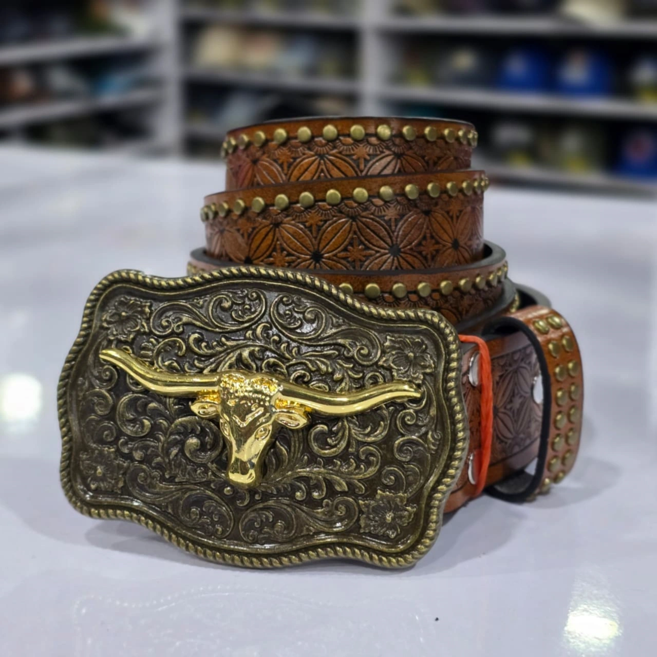 Western-style Longhorn Steer Head Belt, a rugged accessory that combines traditional cowboy aesthetics with intricate artisanal detailing.