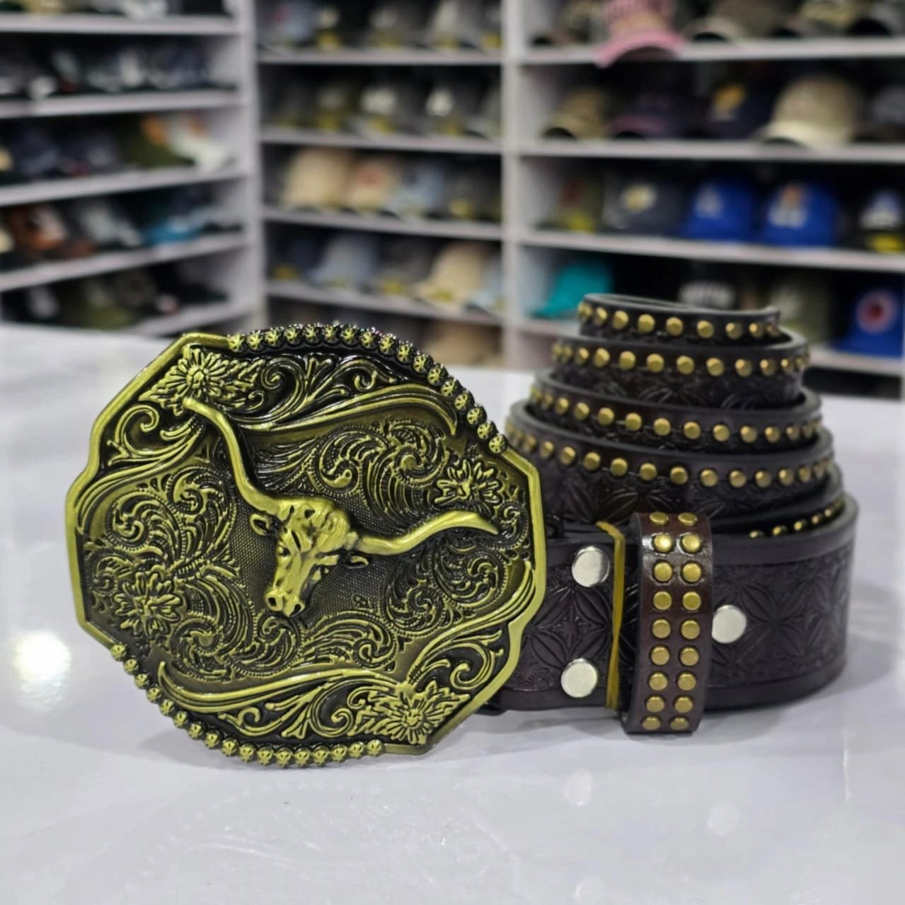 Iconic Buckle: The centerpiece is a large, rectangular trophy-style buckle featuring a prominent gold-tone Longhorn bull head . The buckle itself is typically finished in an antique brass or silver-tone filigree backdrop with delicate floral scrollwork.