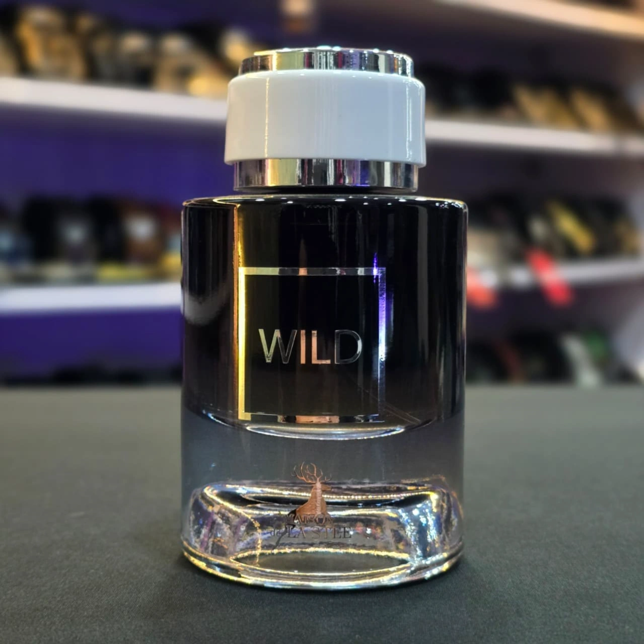 Packaging: Features a sleek gradient bottle with a silver-framed "WILD" label and the brand's signature stag logo at the base.