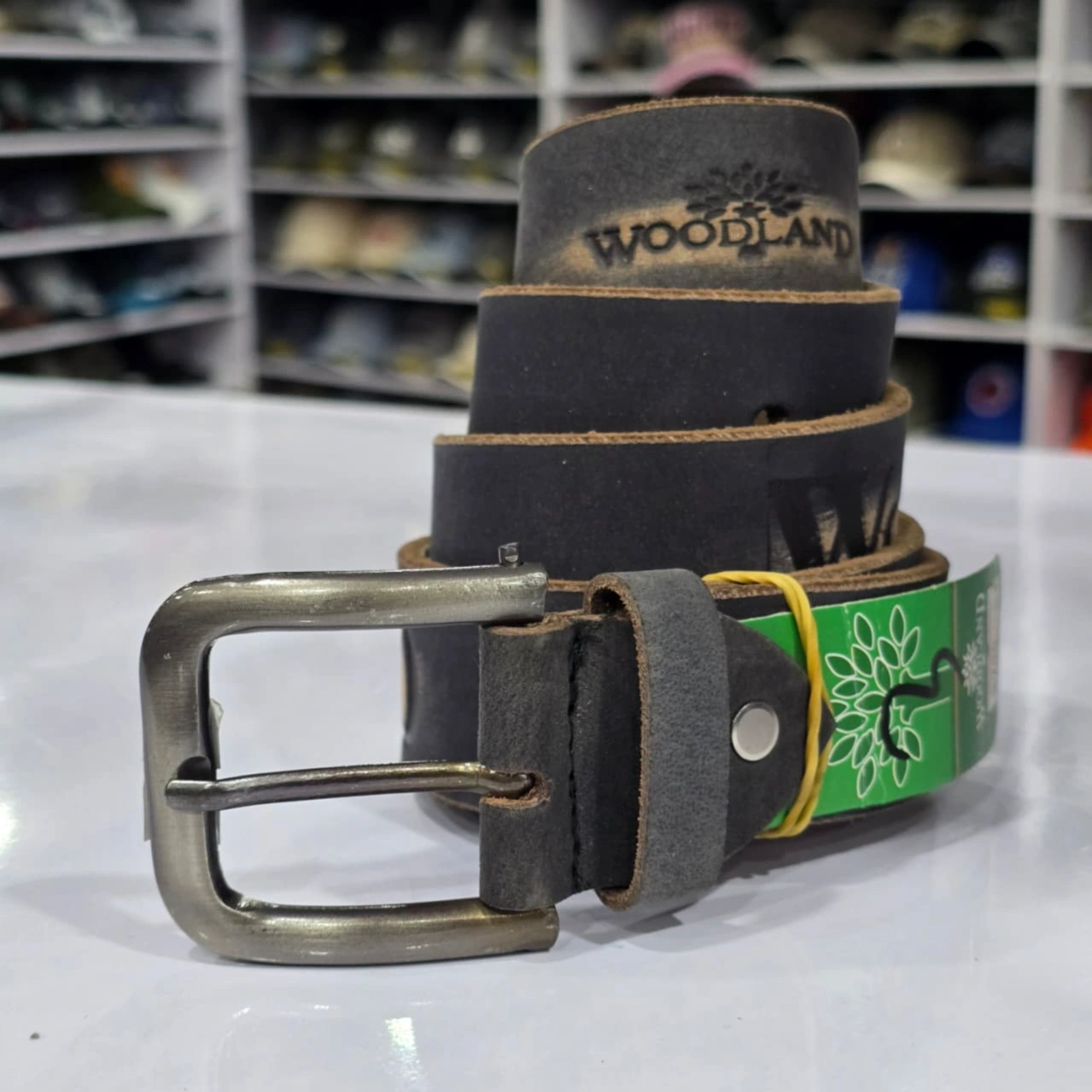 Woodland men's genuine leather belt, recognizable by its rugged design and prominent branding. Woodland is a brand well-known for its durable, outdoor-inspired accessories and footwear.
