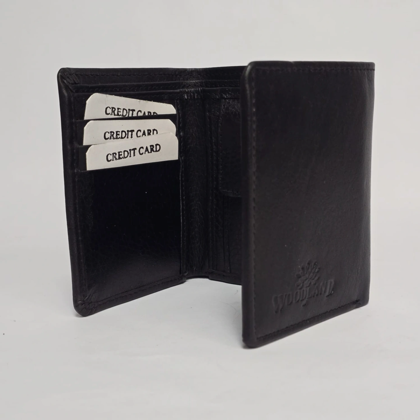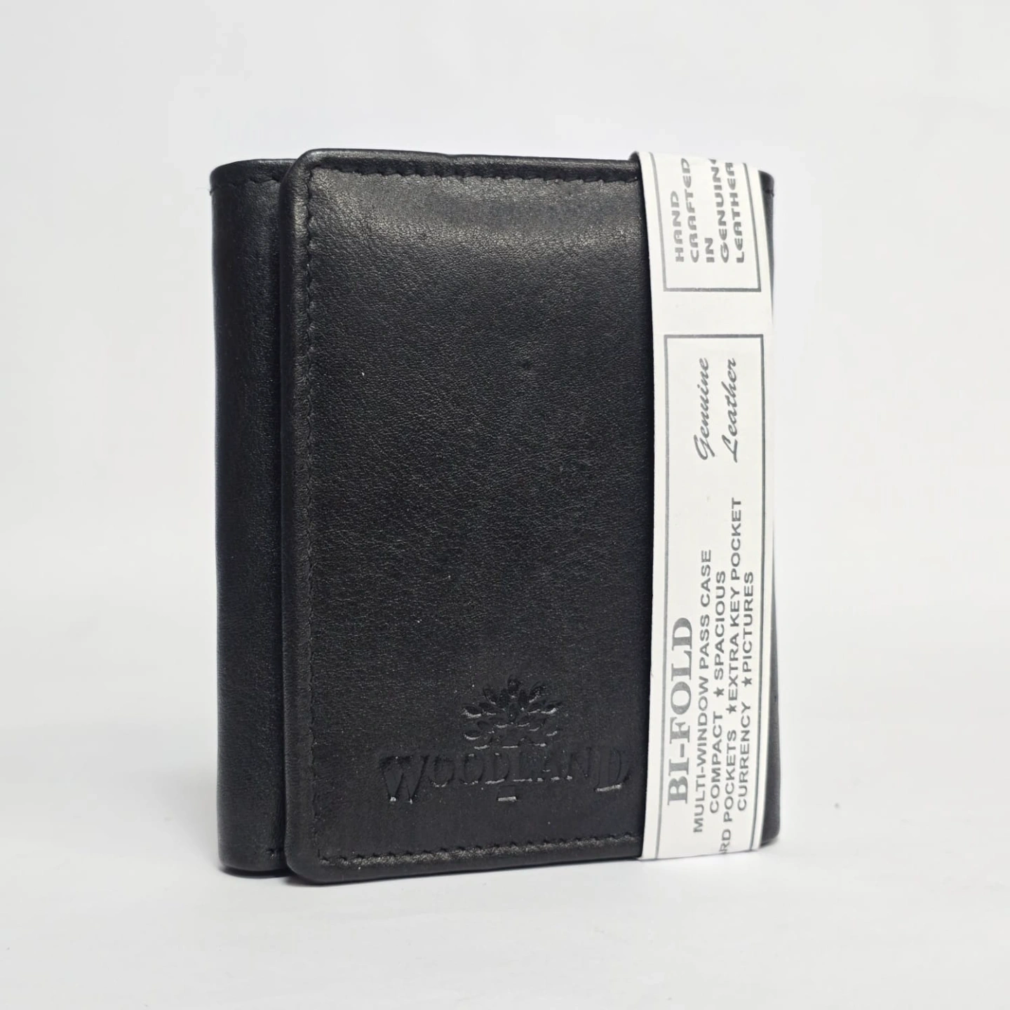 Design: A compact bi-fold structure featuring an embossed Woodland tree logo on the front.