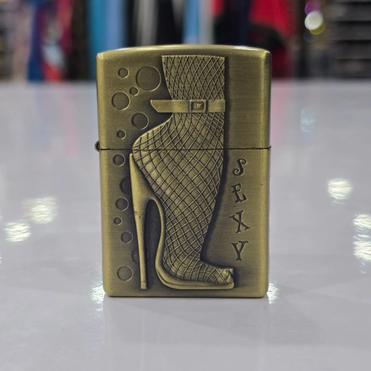Aesthetic: The lighter features a distinctive 3D embossed plate (emblem) depicting a leg in a fishnet stocking and a high-heeled shoe with a buckled ankle strap. The word "SEXY" is vertically engraved alongside the leg.